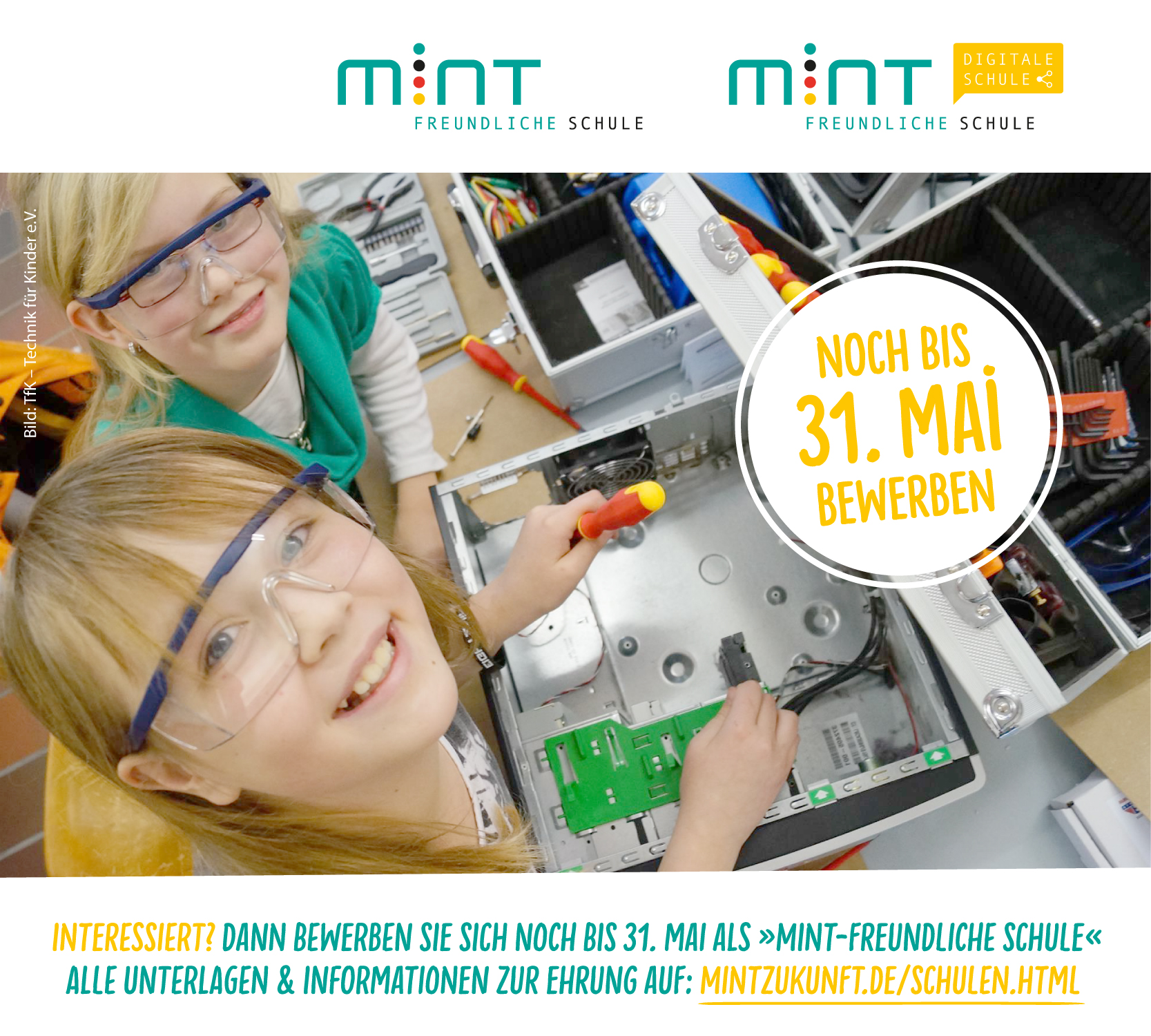 Seit einigen Jahren sind wir Ehrungspartner, von MINT-freundlichen Schulen, sodass Sie die Möglichkeit haben, die WRO-Teilnahme zu vermerken. Die neue Auszeichnungsrunde ist bereits gestartet und es besteht bis zum 31. Mai die Möglichkeit, sich bei der bundesweiten Initiative MINT Zukunft schaffen zu bewerben.